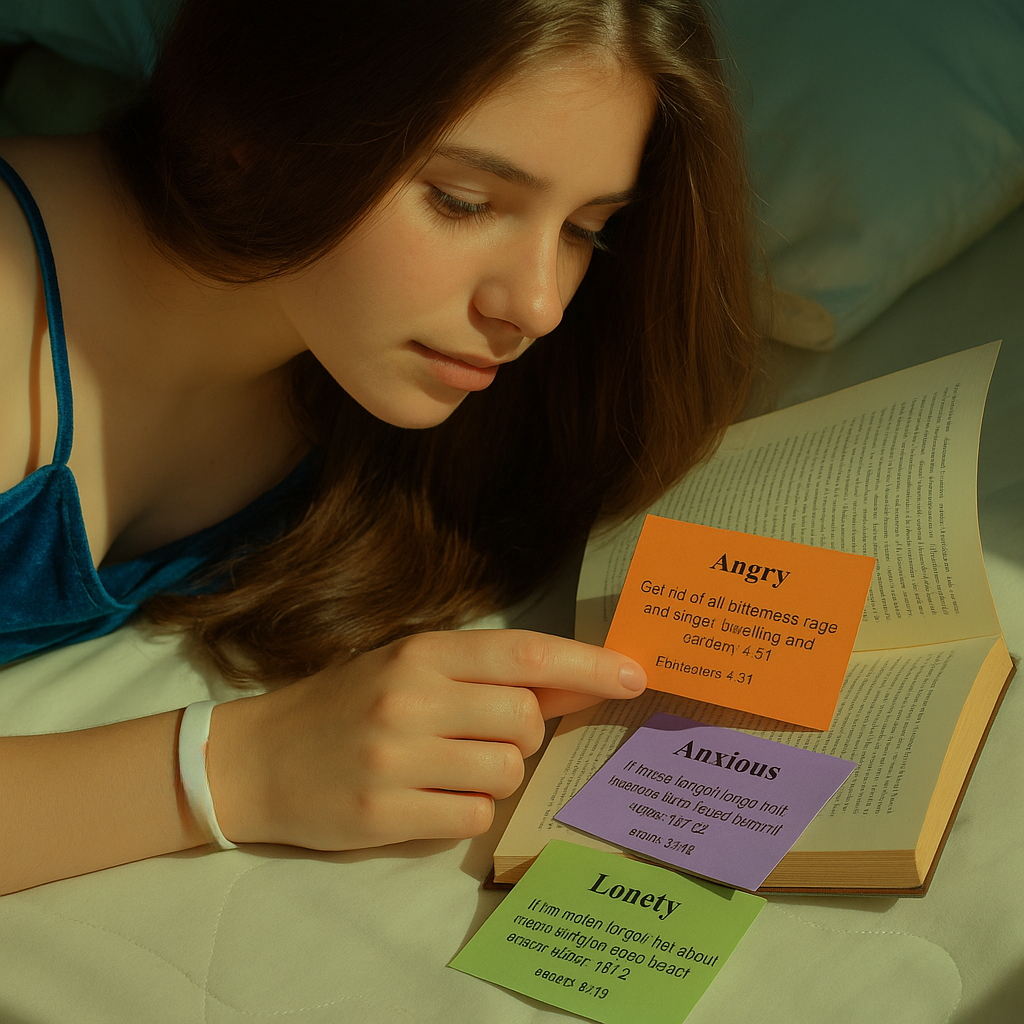 They’re color-coded by mood (happy, thankful, anxious, angry, lonely, sad) so it’s easy to find the verse you need in the moment.